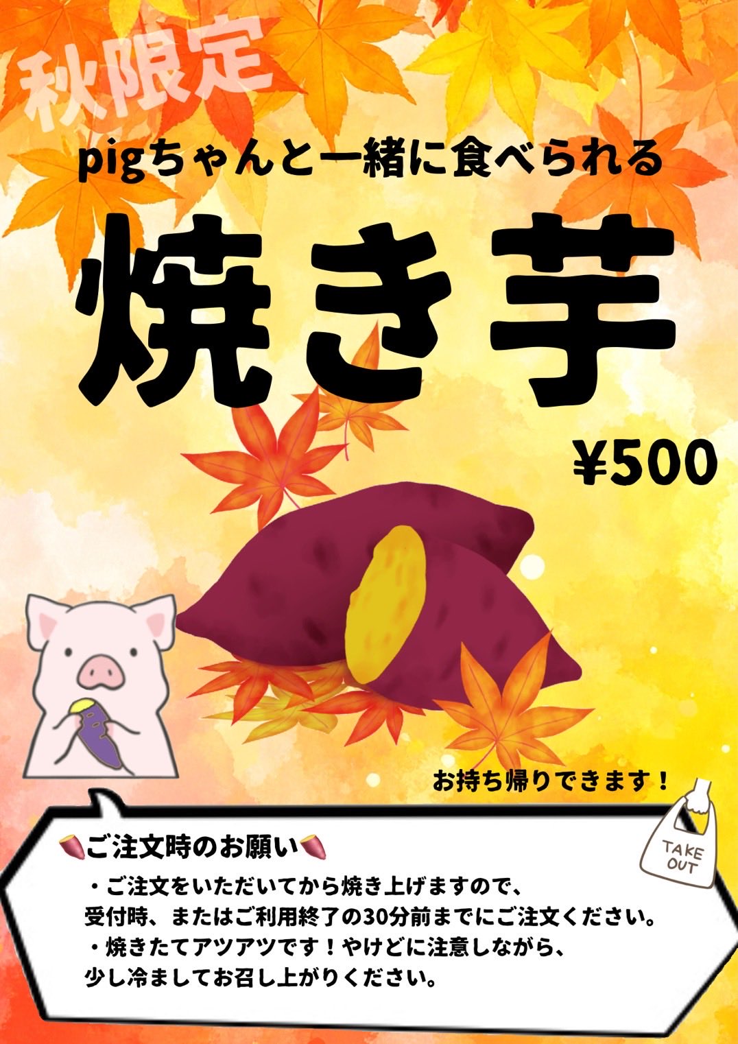 焼きたてほかほかの焼き芋をpigちゃんと一緒にいかがですか?