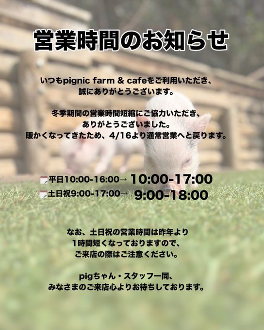 いつもpignic farm & cafeをご利用いただき、誠にありがとうございます。